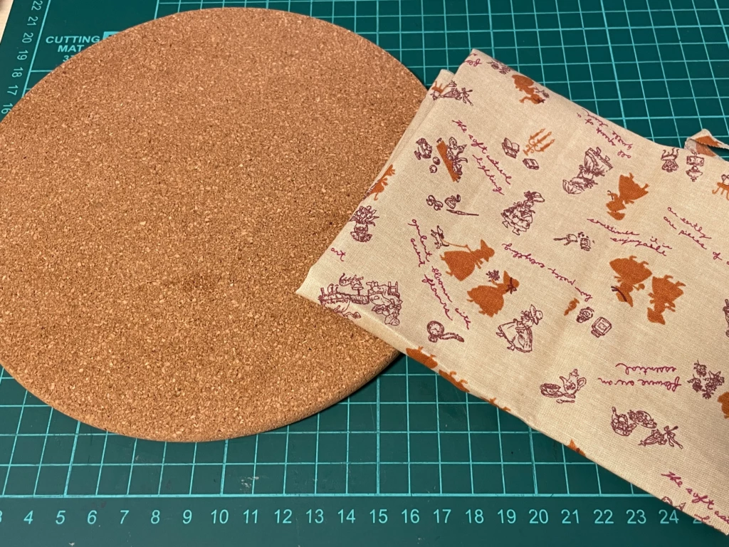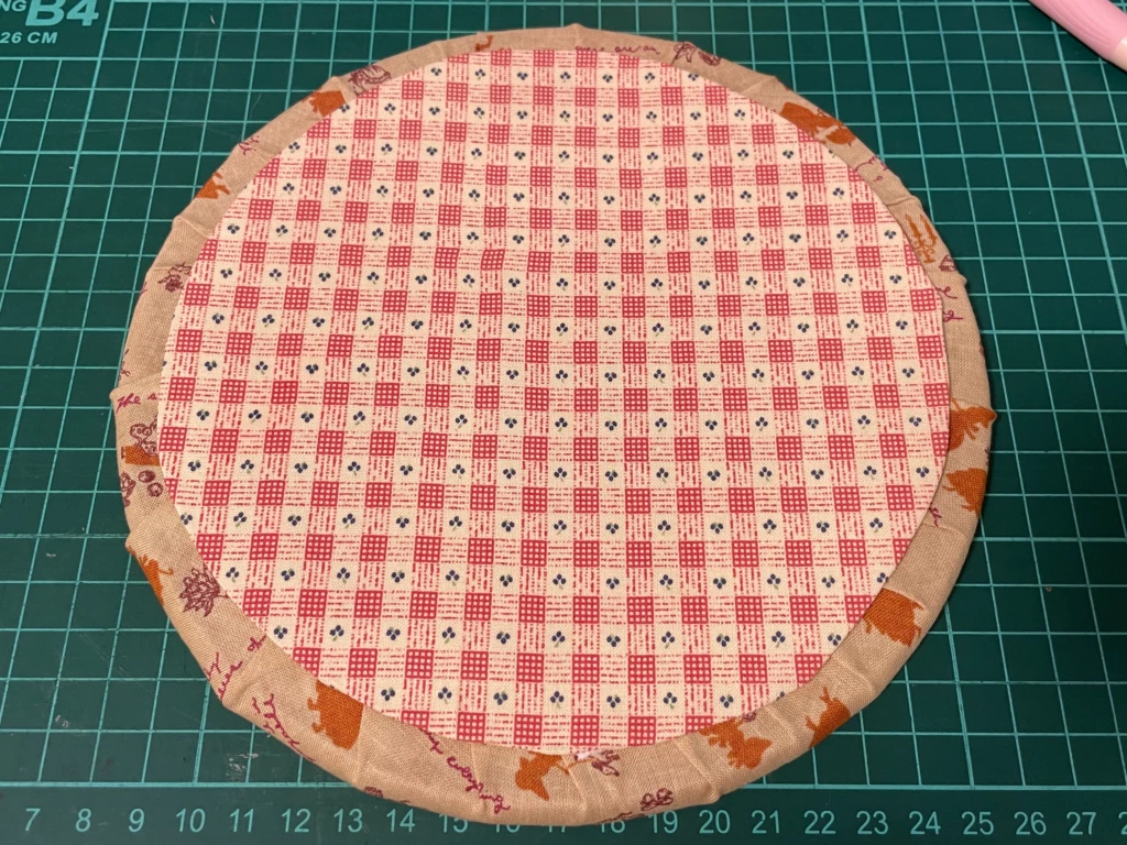 百均のコースターを使って作る場合は、厚みが1cmになるように貼り合わせてから布で巻くことをおすすめします(私はざっくりボンドを塗って貼り合わせました)