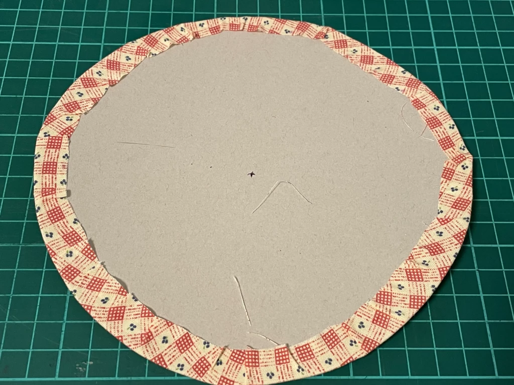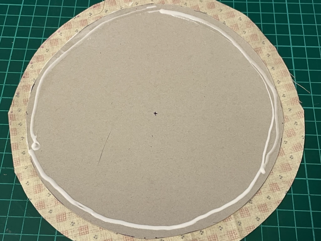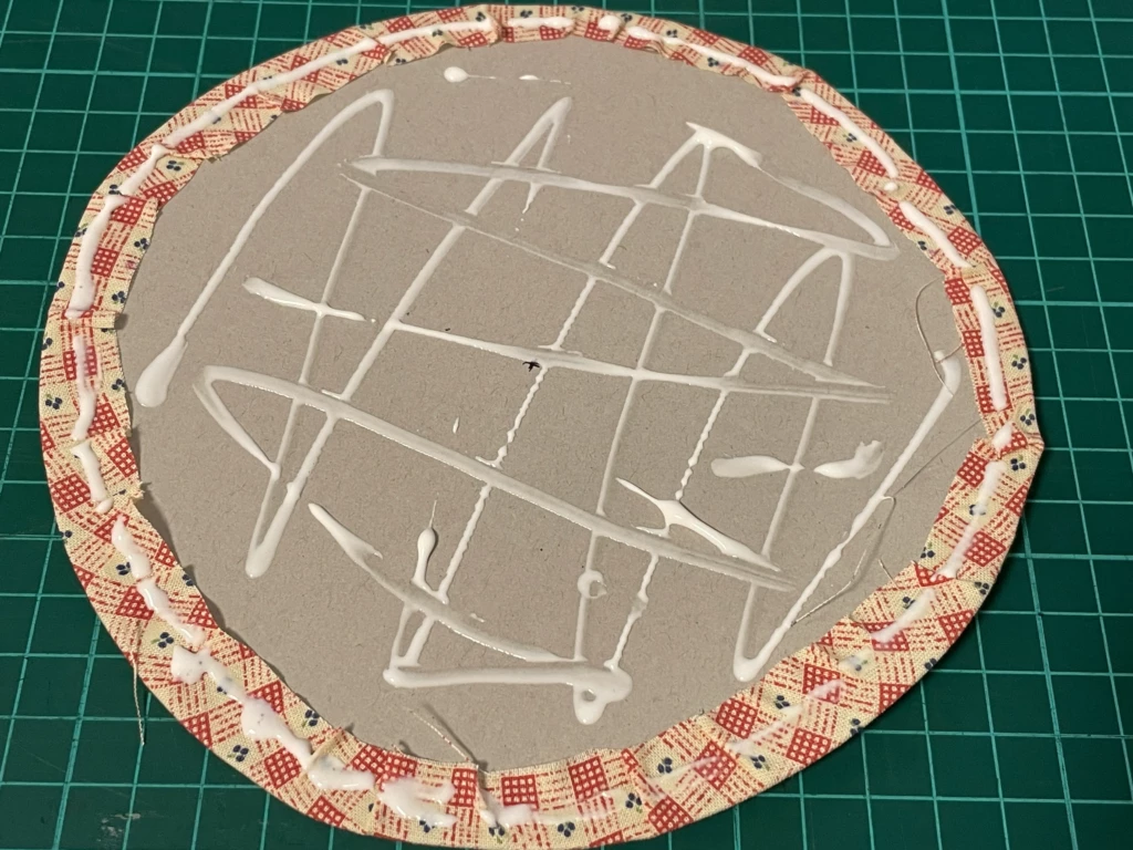 厚紙のフチにボンドを一周塗って、布のフチを貼り付けます