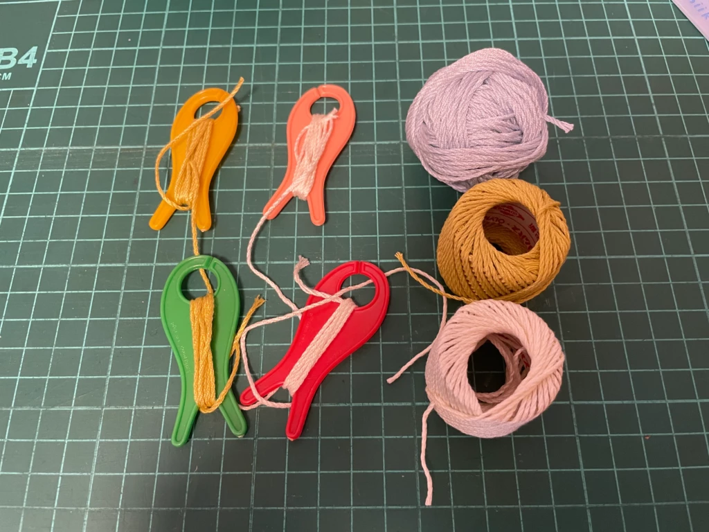 ↑手持ちの魚のボビンに編み込み用の糸を指定の長さ分巻きました
