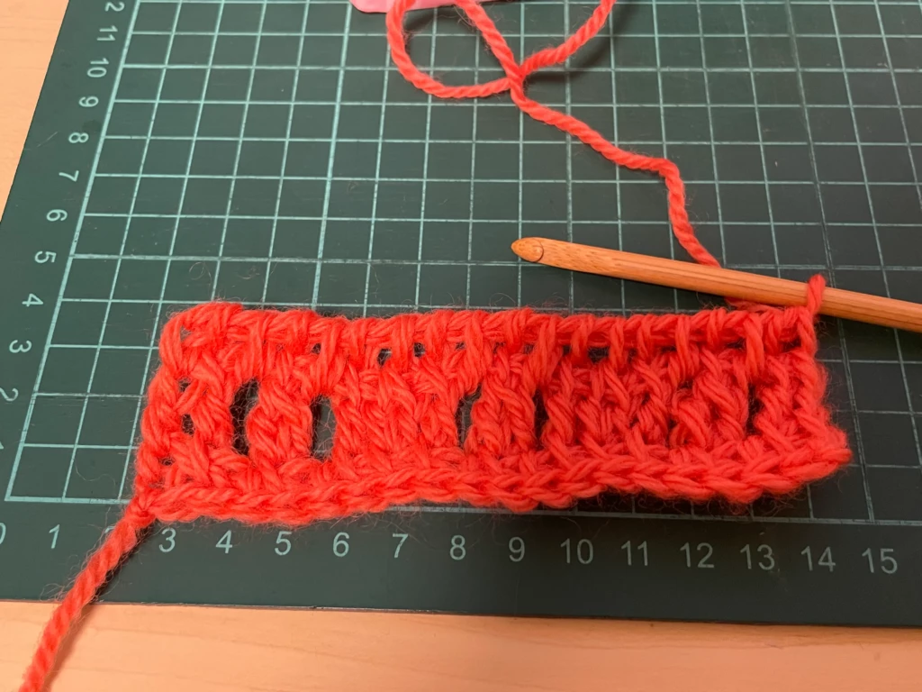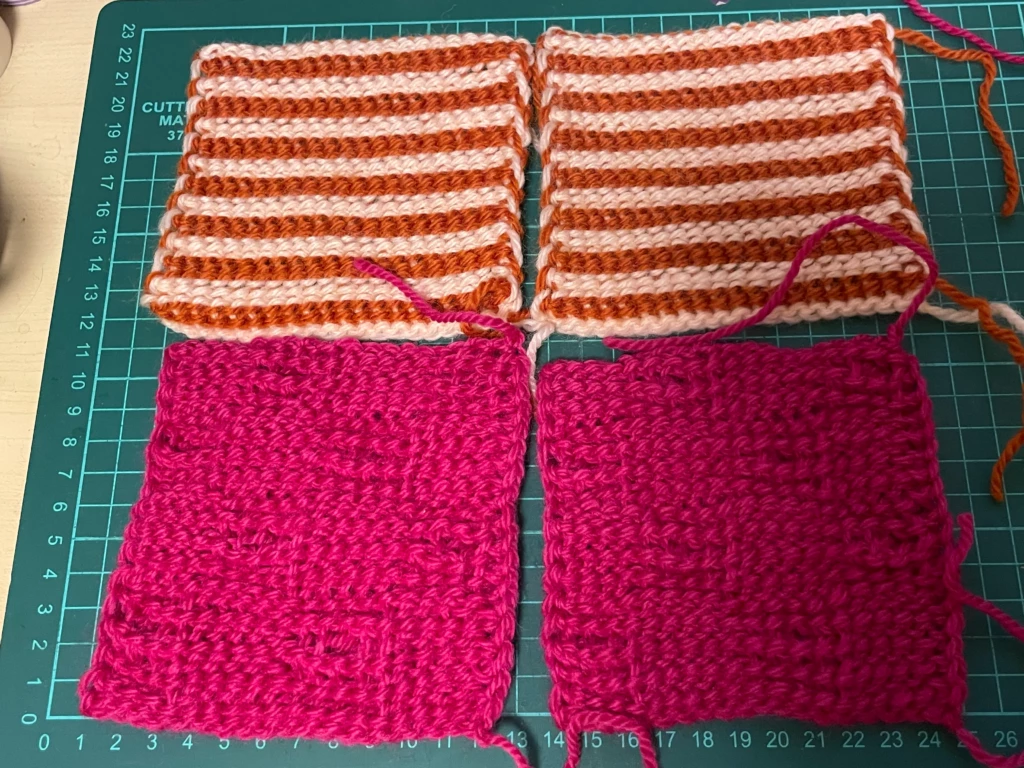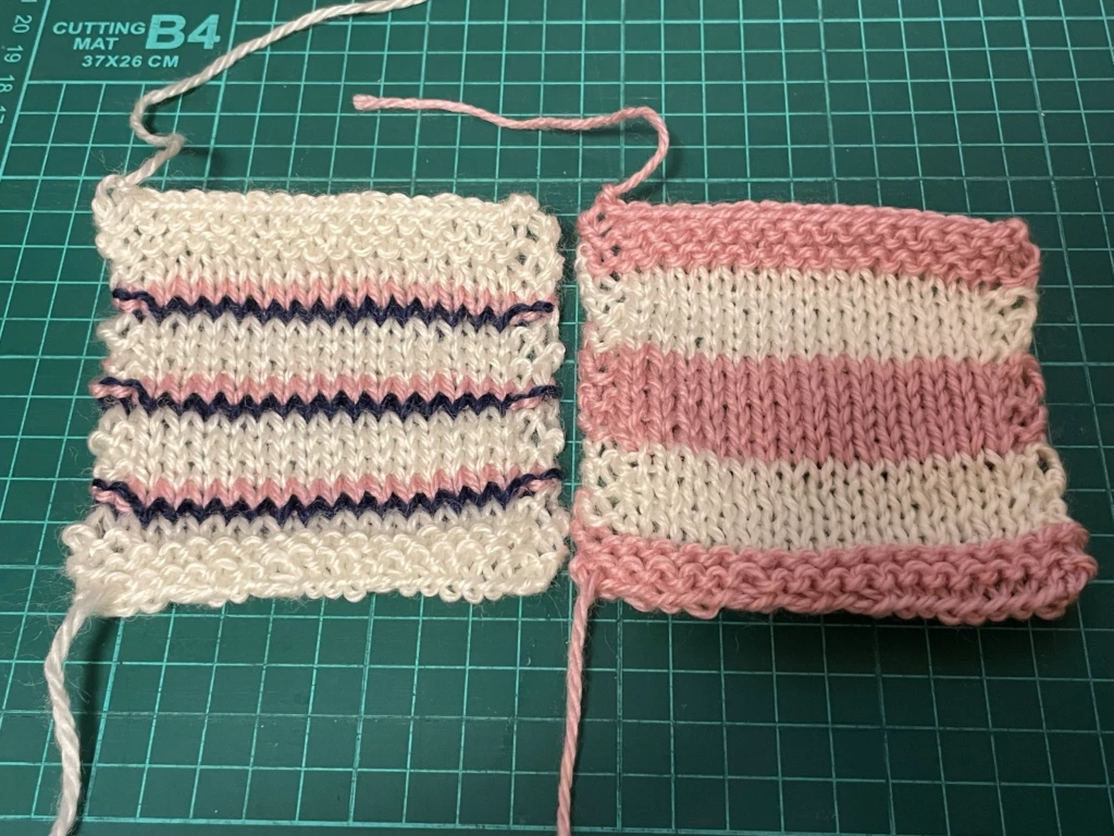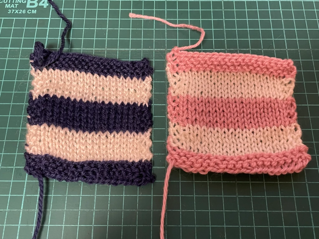 今回やってみたのは、色を替えて編む編み込みと編み目で作る模様編みの練習です