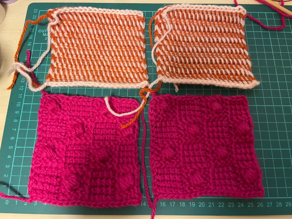 棒針編みとアフガン編みは、編み込みと模様編みができるサンプラーを使って練習しました