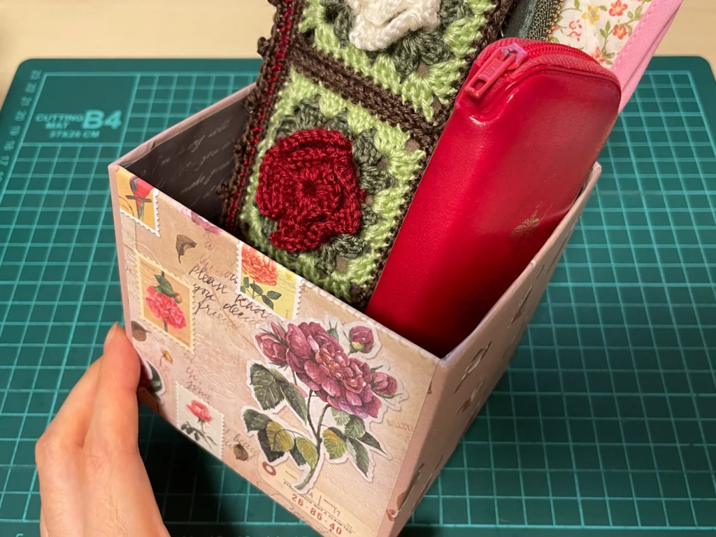 ここのところ、複数の編み針セットを収納カゴから出して手元に置いていることがちょくちょくあって、置きっぱなしはちょっと見栄えが悪いなぁ……と思って、久々に紙もの工作をしてみました