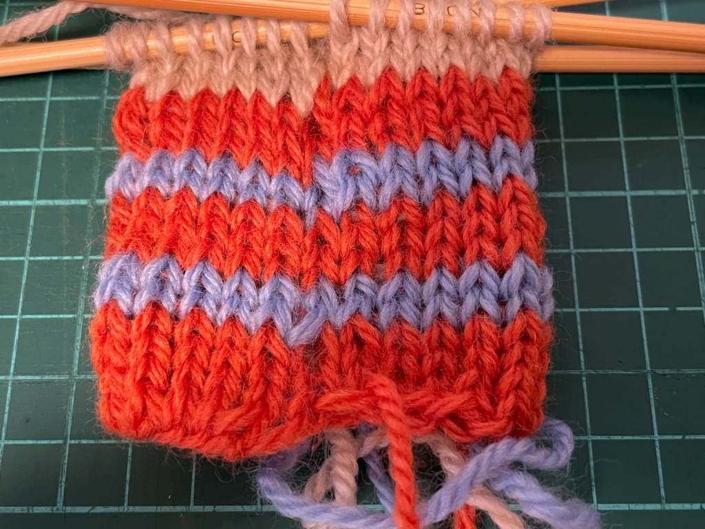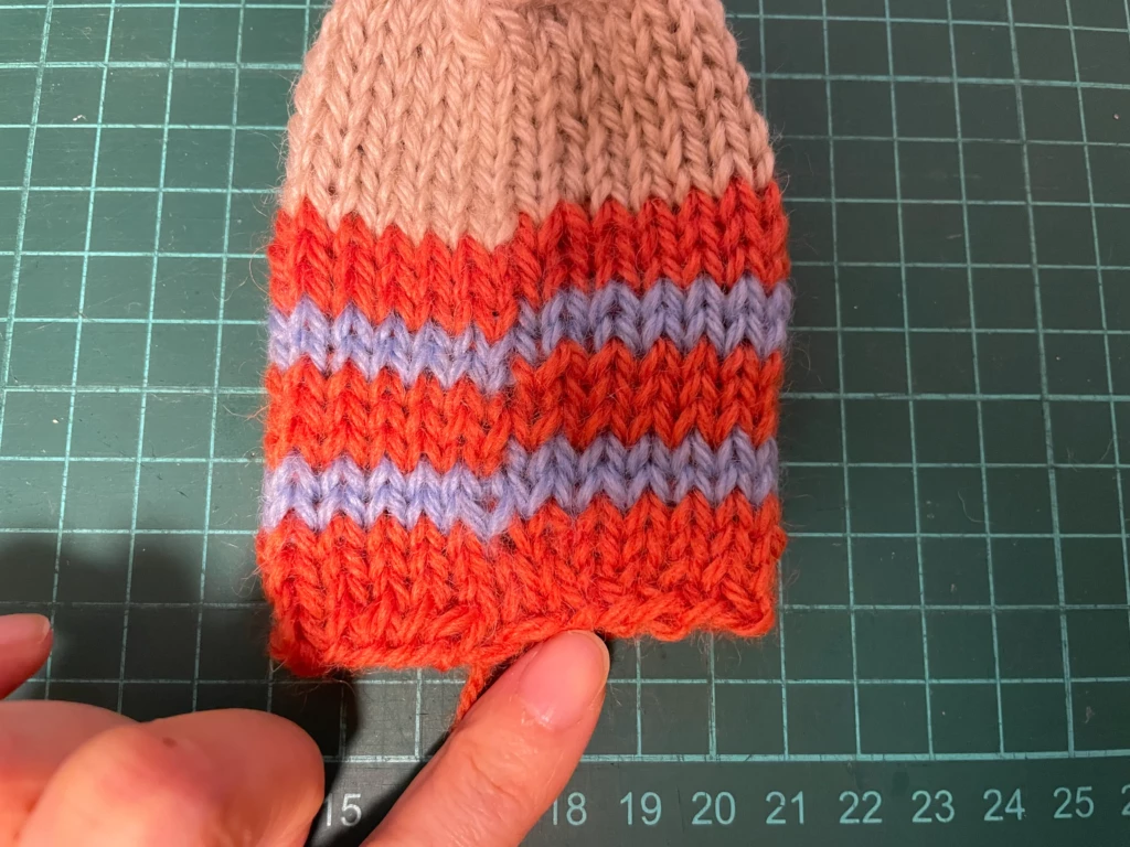 色がオレンジ→水色→オレンジと複数切り変わるときに最初の目だけやや緩めに編むと綺麗に編めるみたいです