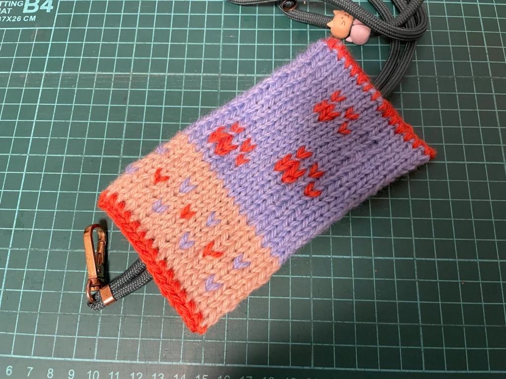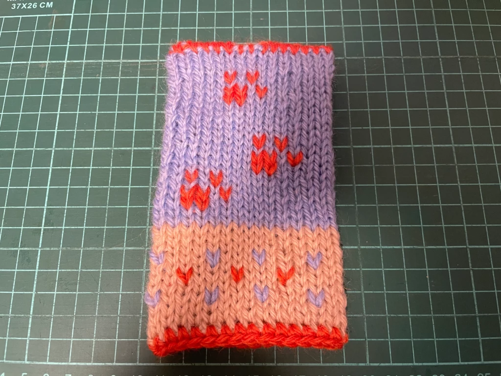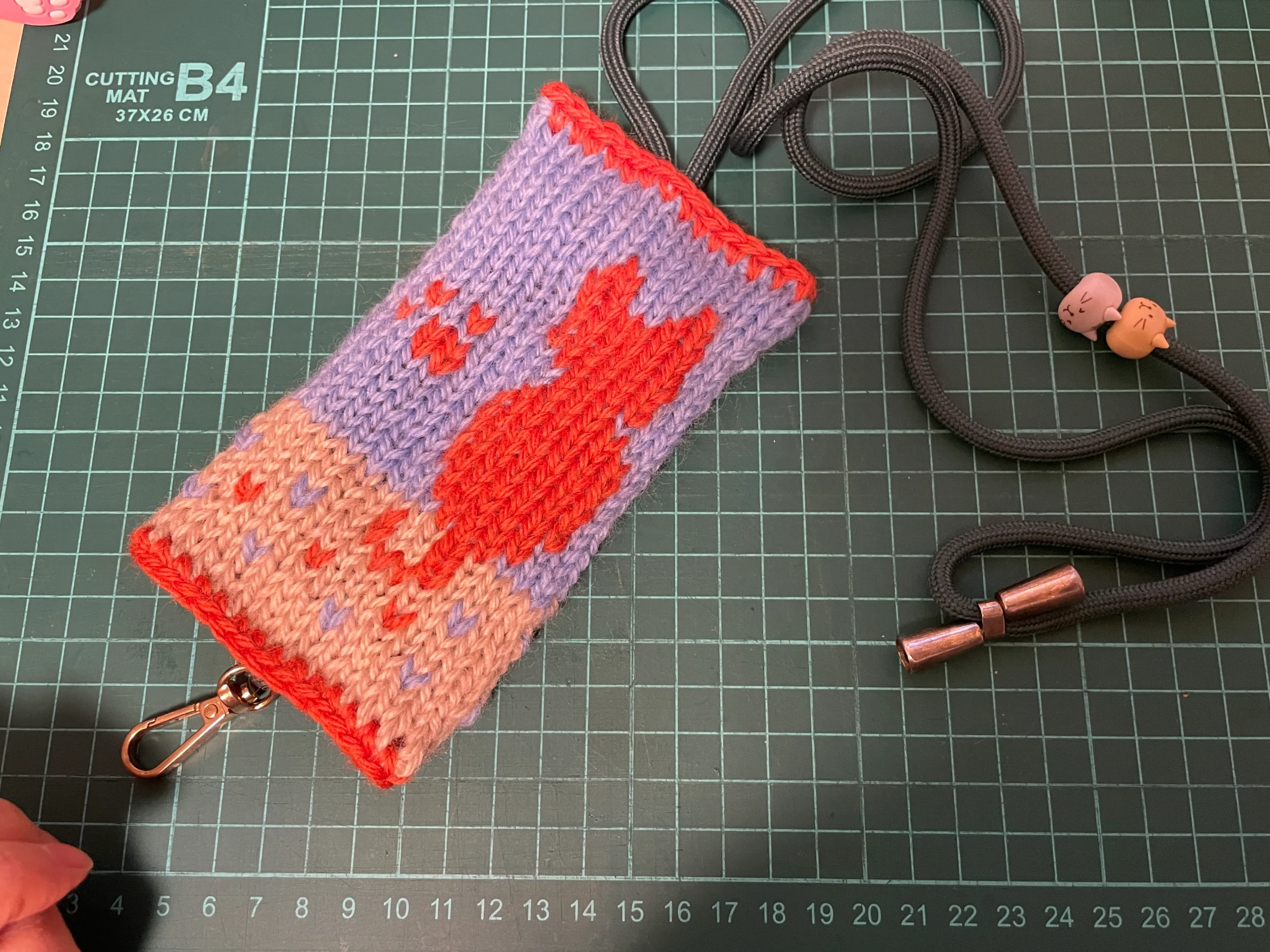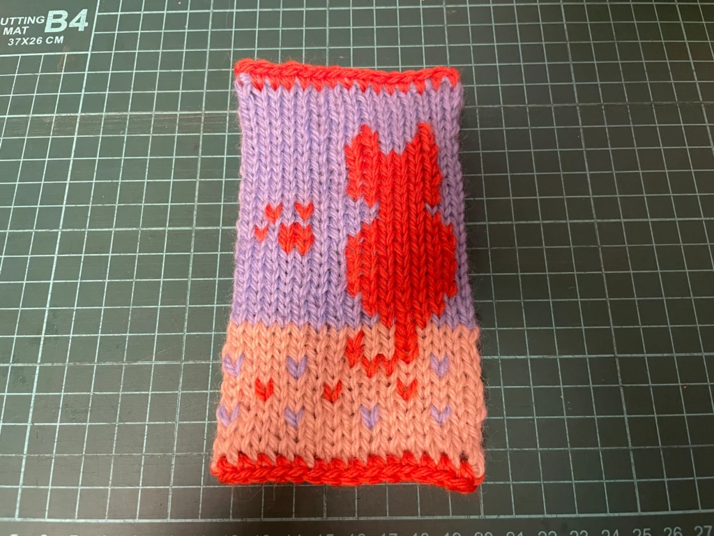 元々の携帯電話ケースの模様がメリヤス刺しゅうだったのもあって、編み込みではなくメリヤス刺しゅうで模様を描いてます