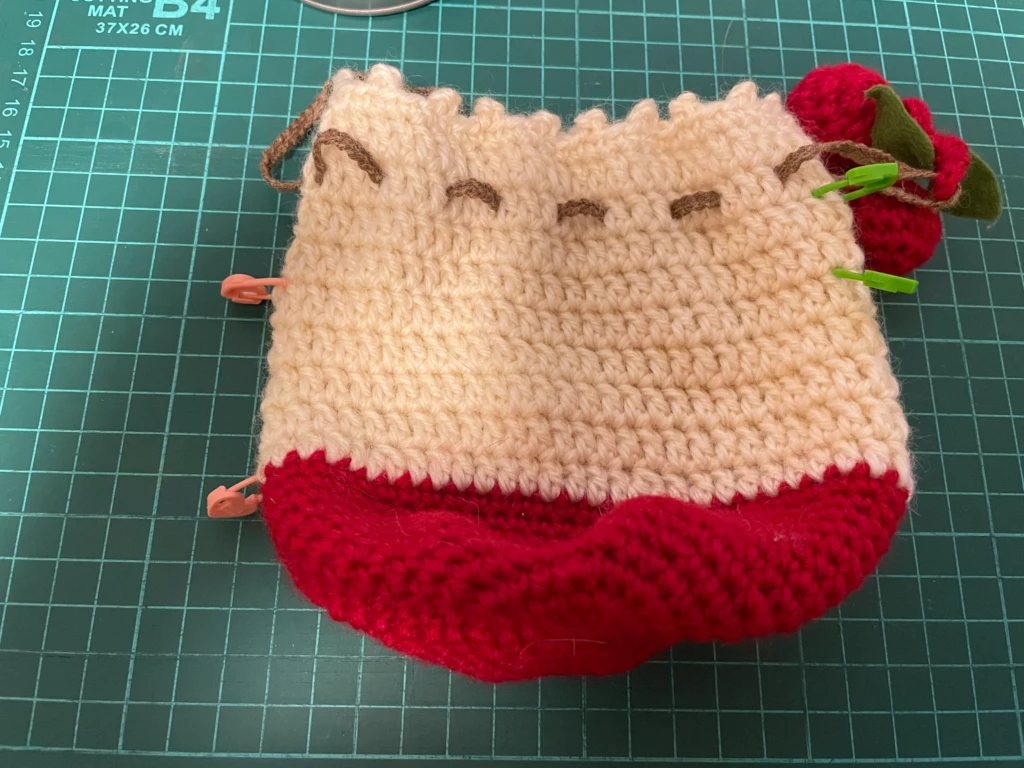 「そういえば、編んだきりで眠ってる毛糸の巾着があったなぁ。あれ、修正できないかなぁ」