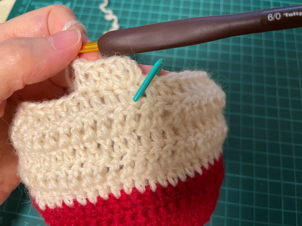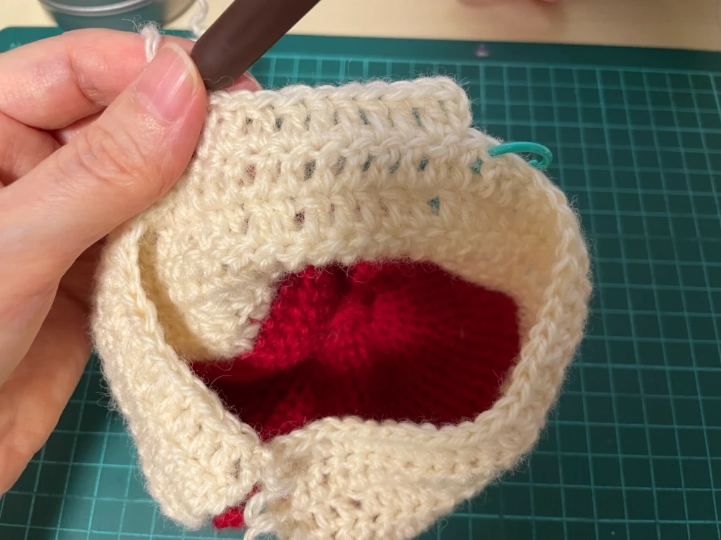 ↑注ぎ口の位置まで来たら、今度はここを起点に往復編みです