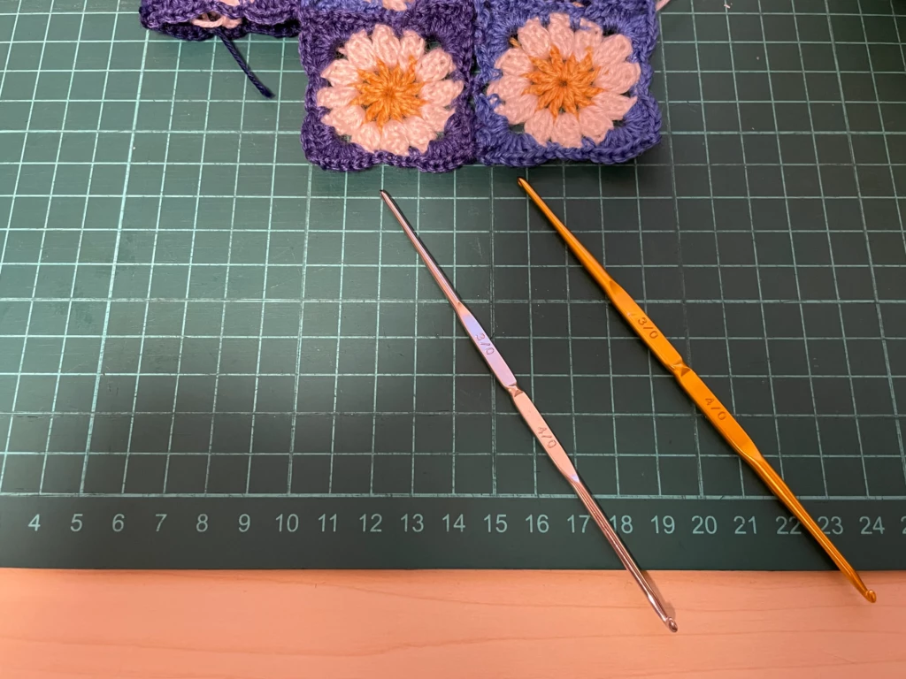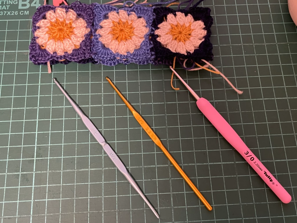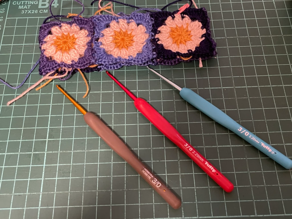 実は私は以前から金属針が編みやすいと感じていて、よく色付きの両かぎ針を使っていたのですが、今回のモチーフも結局両かぎ針が一番編みやすいという結論に落ち着きました笑
