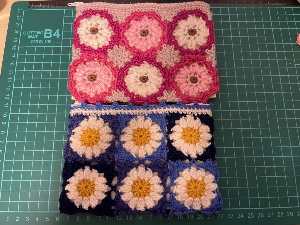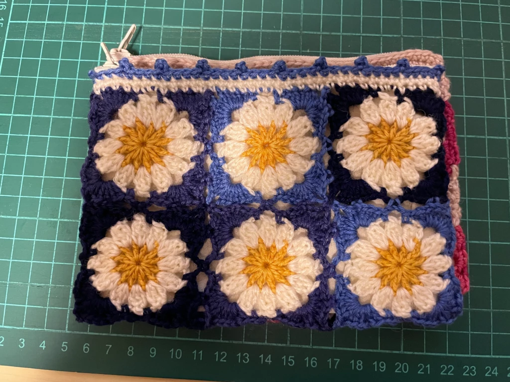 『かぎ針編みのお花モチーフのポーチ』のマーガレット