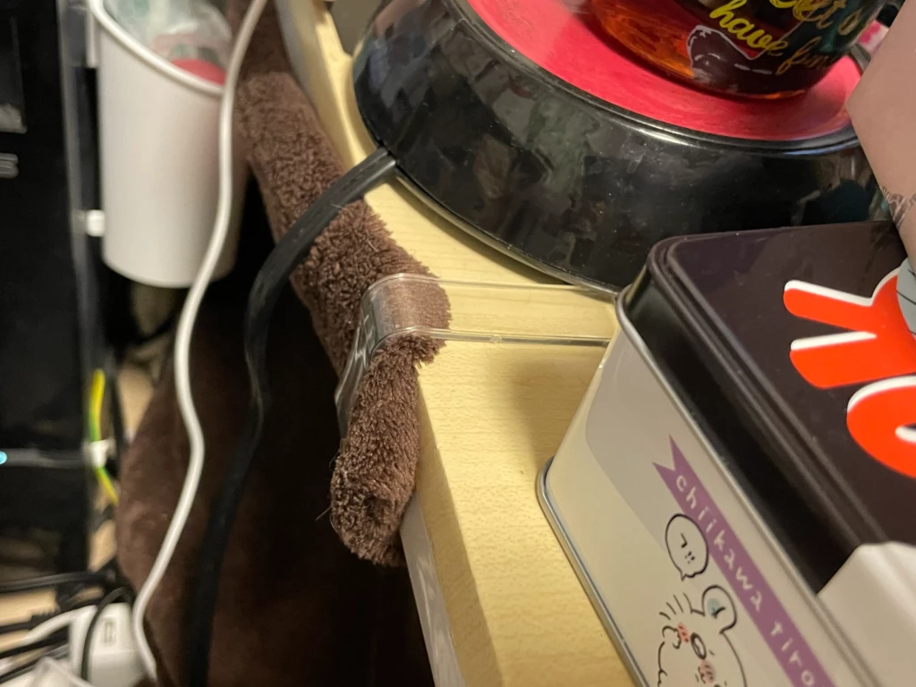 ↑使わなくなっていた百均のテーブルクロスクリップでデスクに留めました