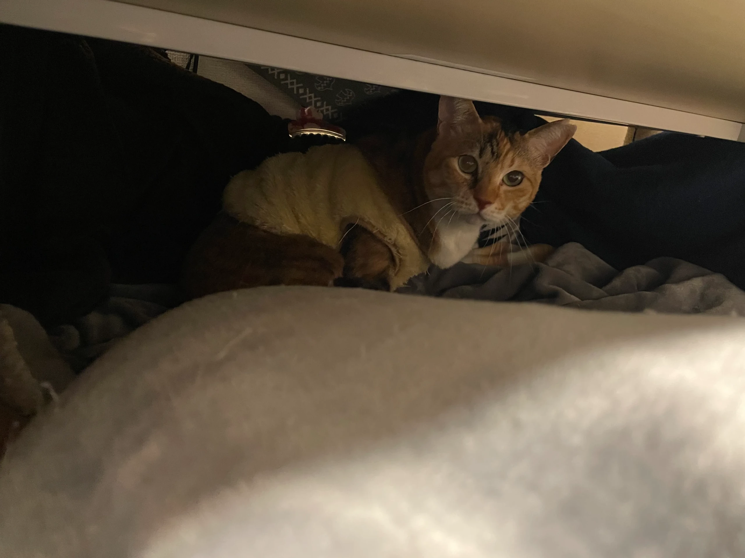 ↑私がひざ掛けとして使ってる電気掛毛布の上にいるので、急遽デスク周りを百均ひざかけで覆うことに…