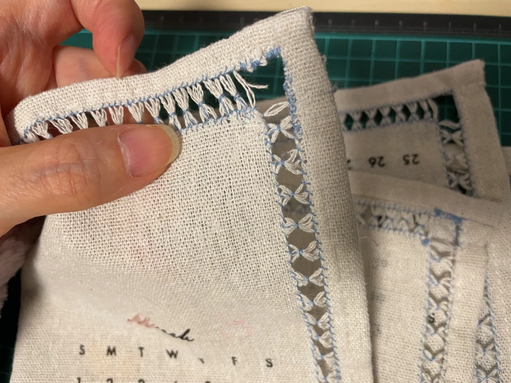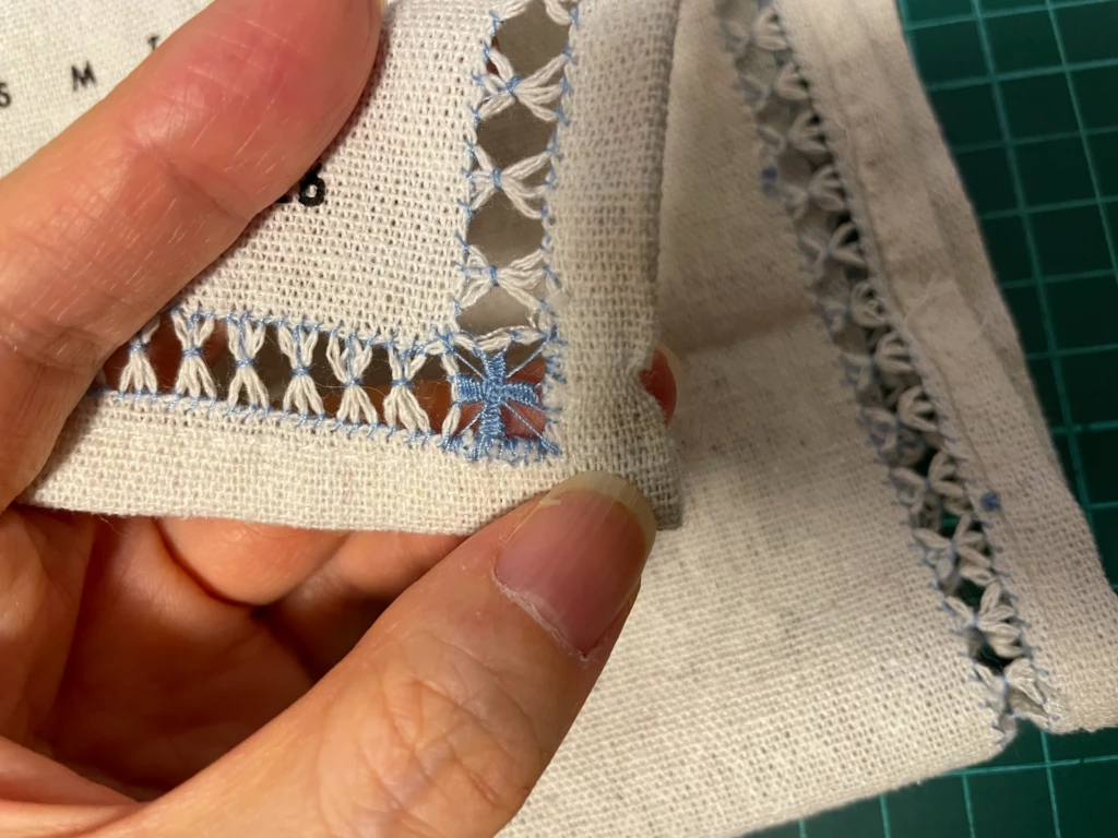 パッと見がまっすぐに見えていたので、これなら端にドロンワークをして可愛くできるのでは? なんて甘い考えで始めたのですが、百均の布の歪みを軽く見すぎていました