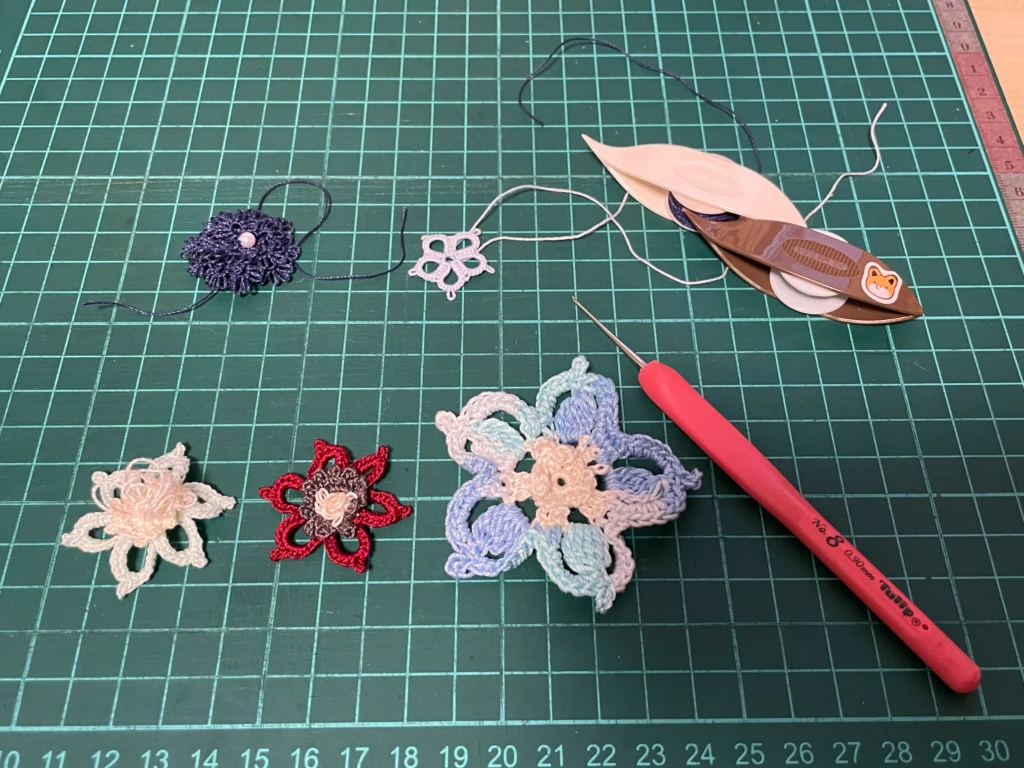 ↑タティングとクロッシェの二つを編んでます