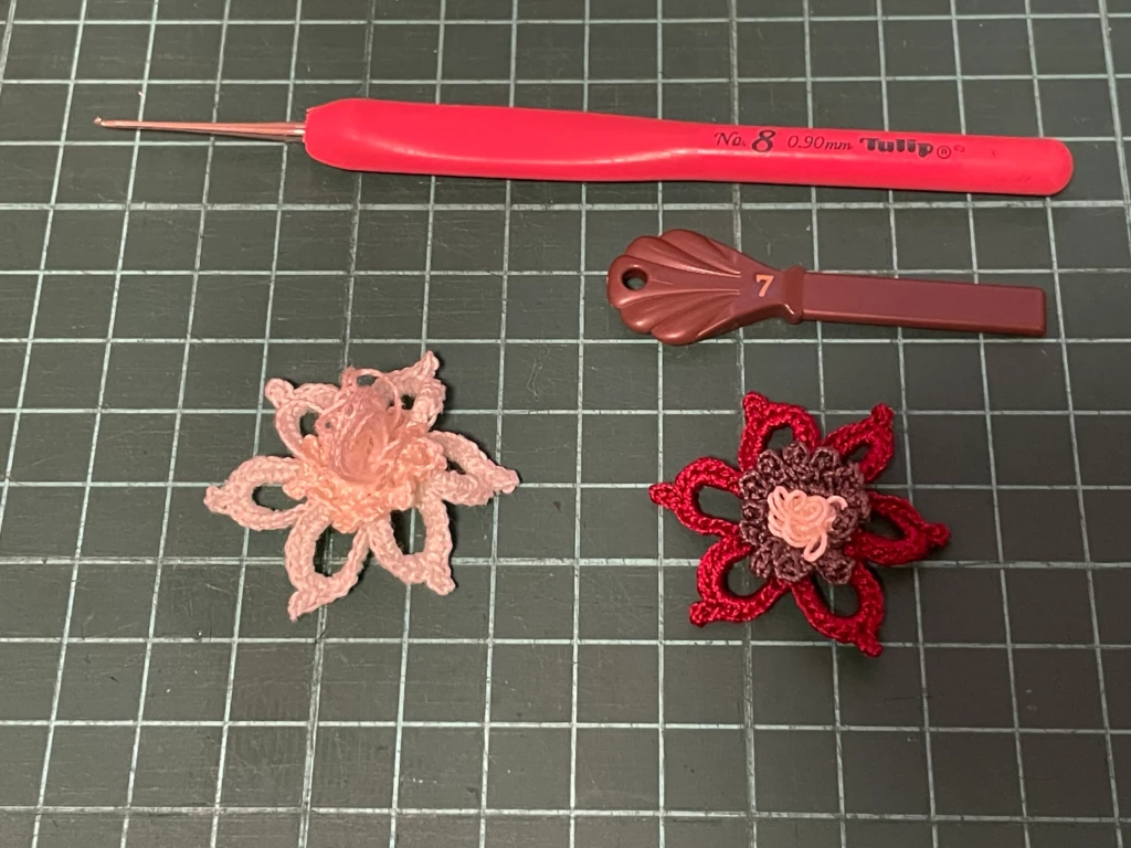小さいモチーフを色々と編んでいるのですが、そのうちの一つ、リング編みを使ったモチーフのリング編み部分をもう少し小さくしたくて、手持ちのピコットゲージで試しに編んでみました