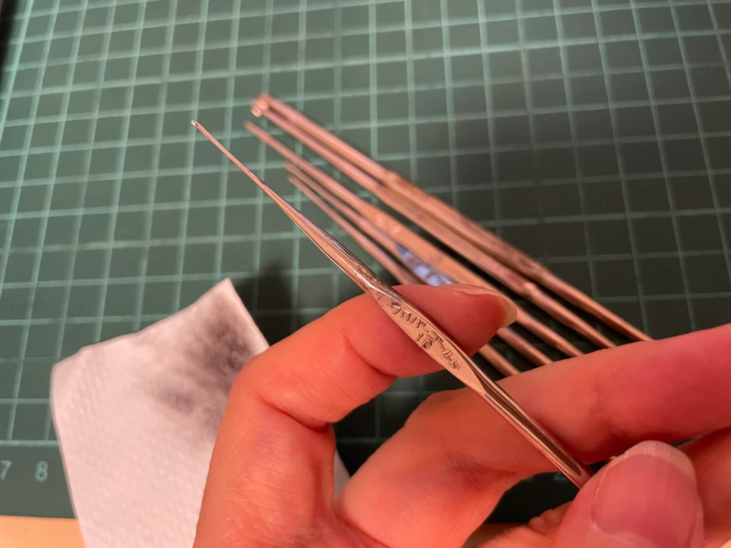 今回磨いたレース針はフリマなどでまとめて譲っていただいた中にあったものなんですが、まとめ売りの中に目当ての編み針があったときには特にバラ売りをお願いすることもなくそのまま買うことが多いので、金属針はけっこう本数を持ってます