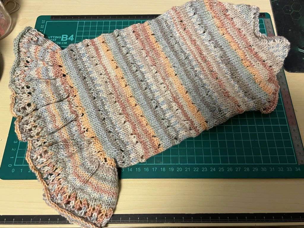 前回編んだときには気付かなかったのですが、今回試着して貰ったところ袖周りも少しキツそうに感じたので、そちらも4目ほど増やして袖刳りを調整