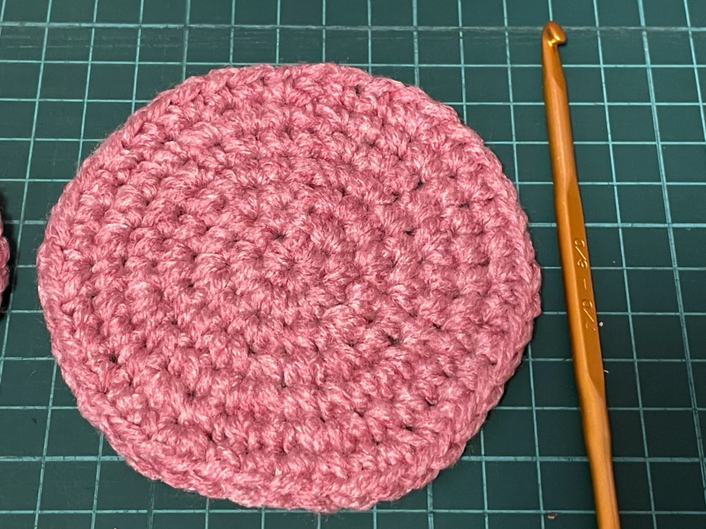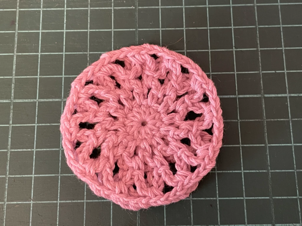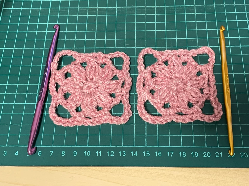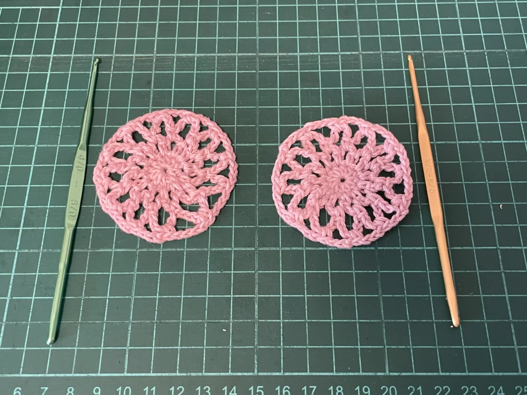 最後に細編みの円形モチーフを編んだのは、以前見た百均かぎ針とメーカー品を比較する動画で、百均かぎ針で編んだシンプルな円形モチーフが波打って平らにならなかったのを思い出したからです