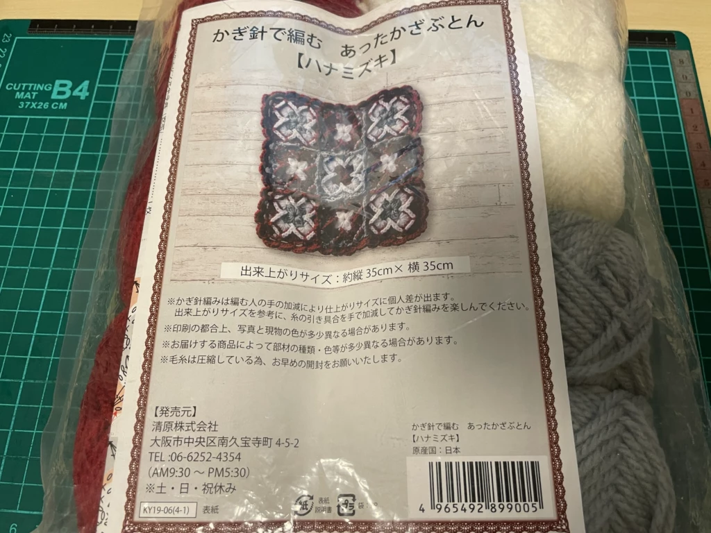 ↑かぎ針で編むあったかざぶとん【ハナミズキ】。清原のキットです。