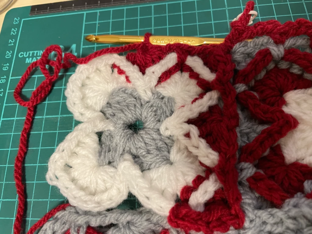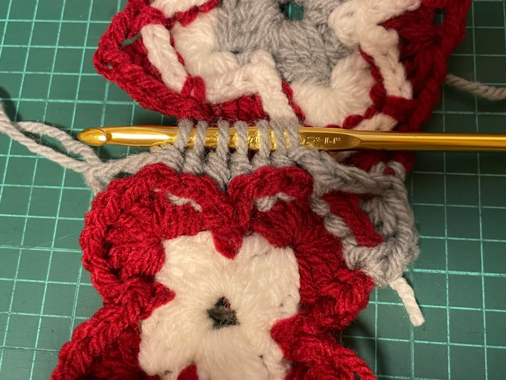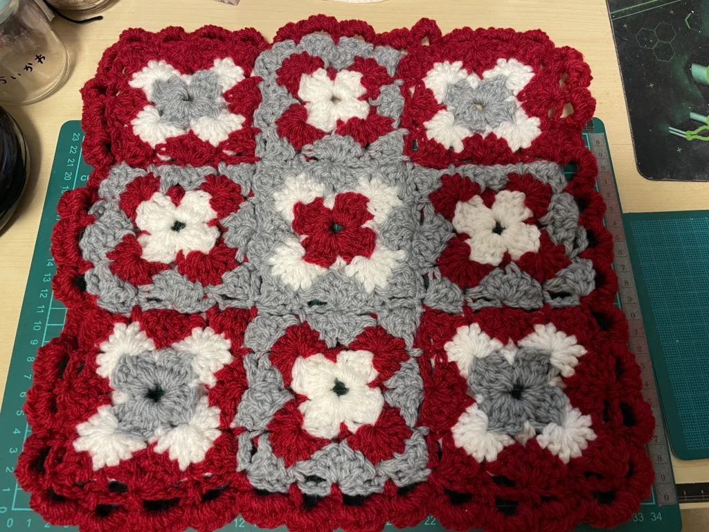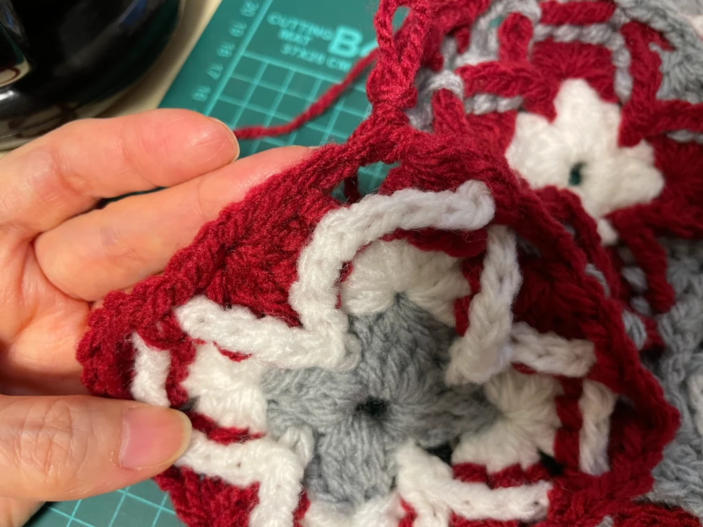 ↑最後の縁編みを編んでいる最中に、モチーフの一つで細編みを編み忘れてることが判明!