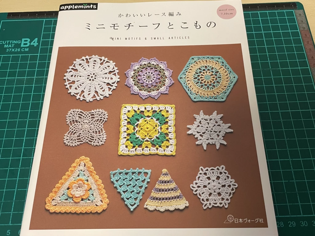 以前から欲しかったアップルミンツのモチーフ編みの本『かわいいレース編み ミニモチーフとこもの』のお安くなっている古書を見つけて、大喜びで入手しました
