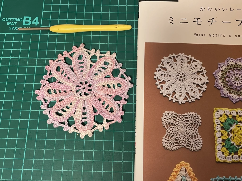 で、いざ編んでみようと中を見てみたのですが、欲しかった時期と今の自分とでは編みたいモチーフ……というか編みたい糸のサイズが変化してしまっていて、あまり心に刺さるものが無くて、少し残念になりながら一つ編んでみました