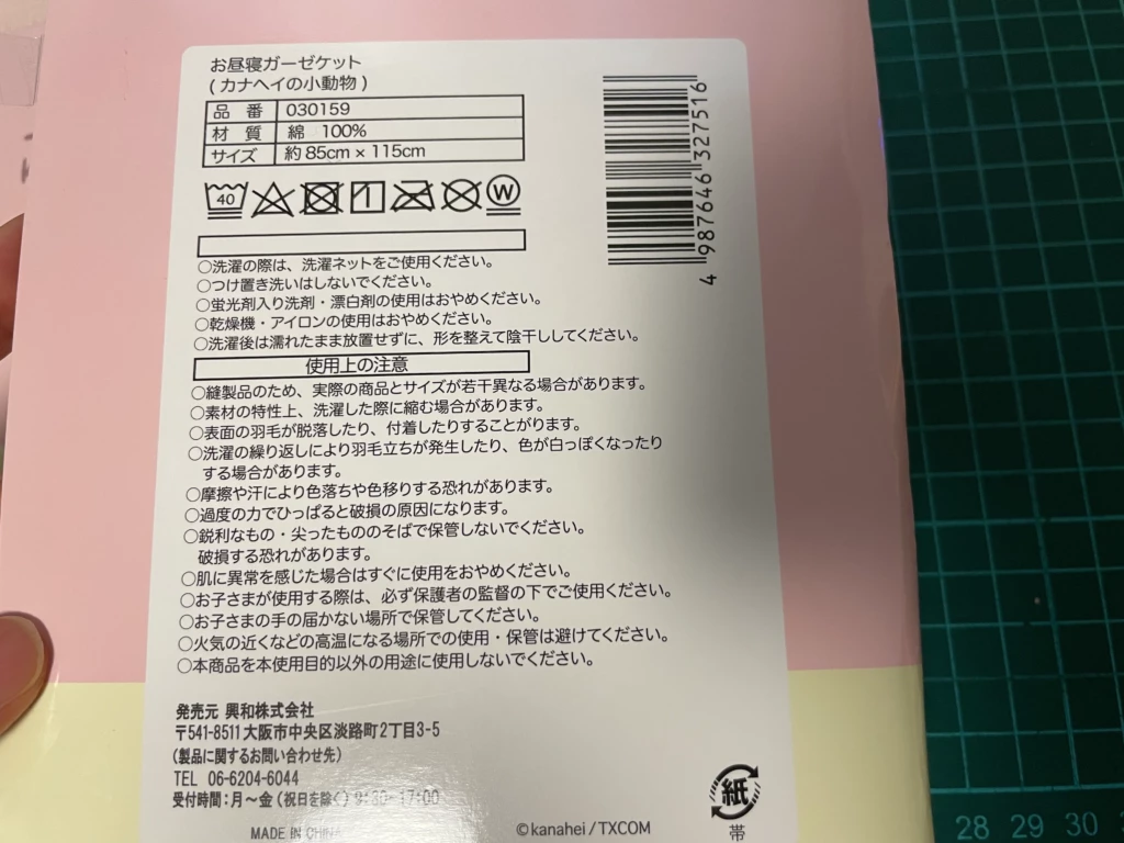 ↑綿100%。85cm✕115cmのお昼寝ガーゼケットです