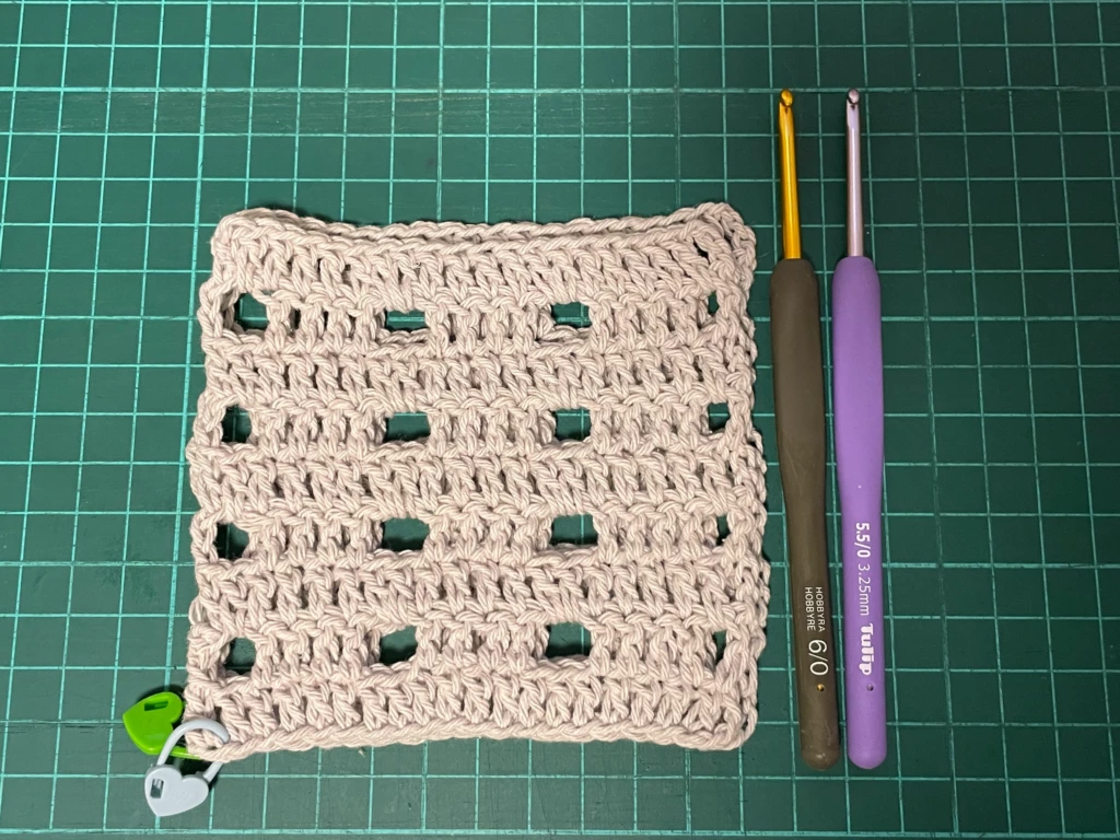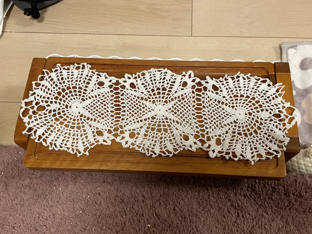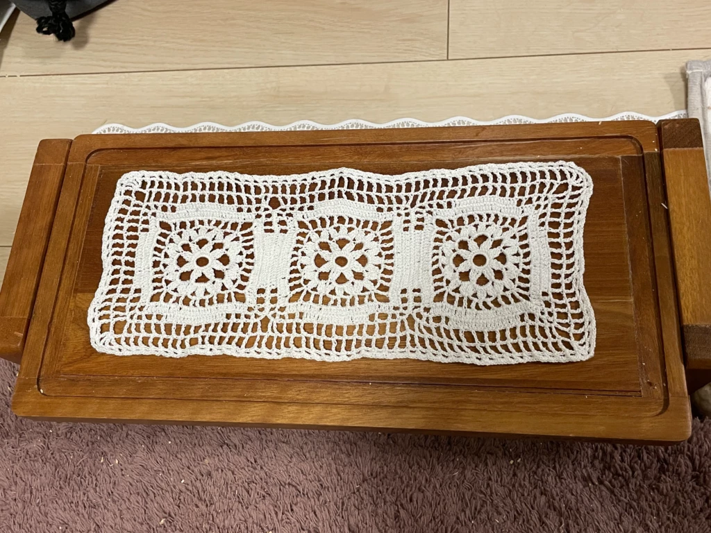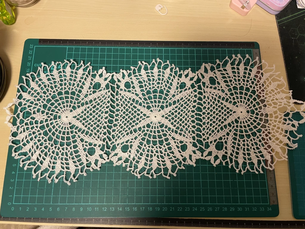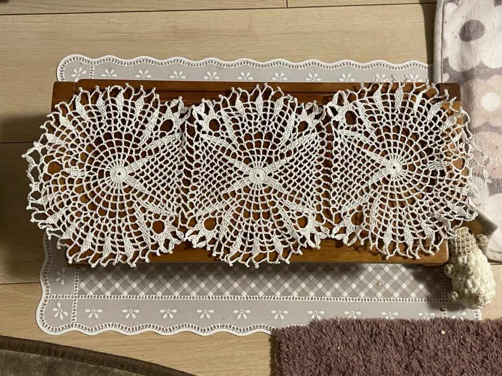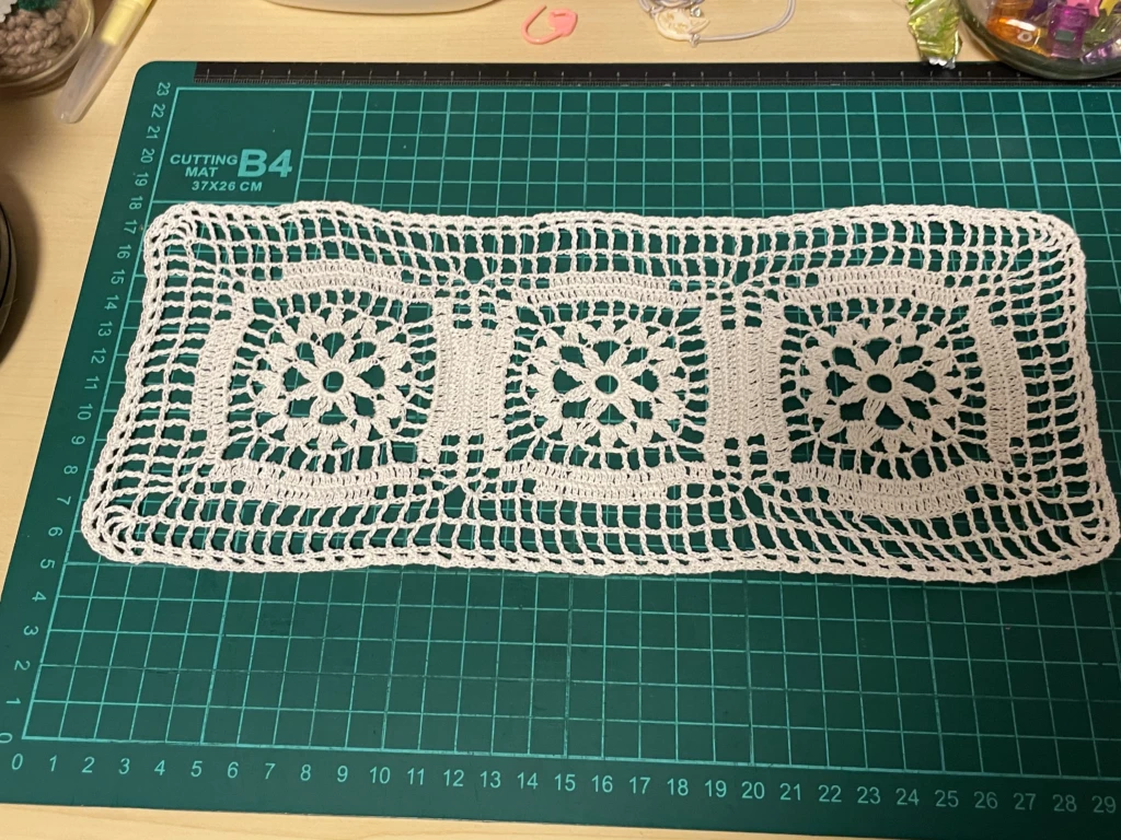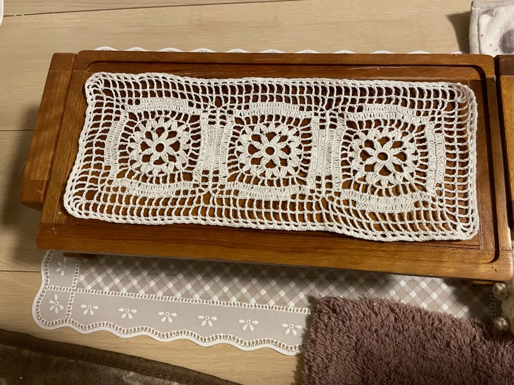 これまではコースターサイズやハンカチのエジングくらいしか編んでなかったので、洗濯後のサイズ感ってあんまり気にしてなかったんですが、テーブルクロスとして使うつもりならけっこう大きめに編まないとダメかもです汗