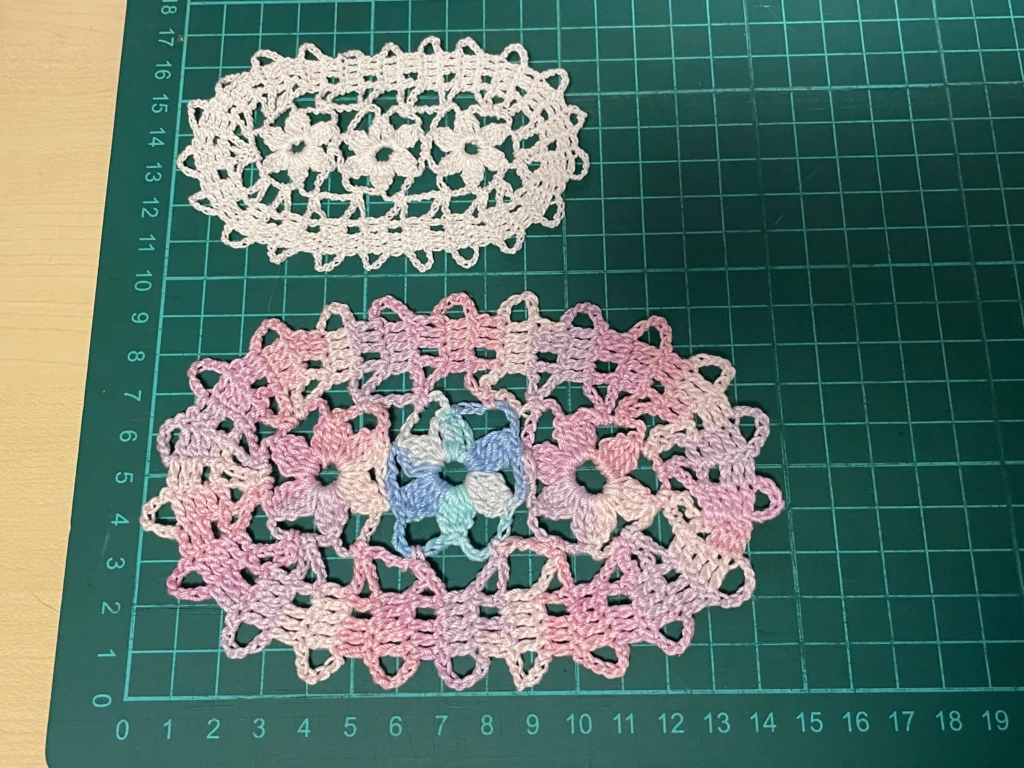 ↑6/0号と5.5/0号で編んだモチーフを重ねてみました。ちゃんと6/0号の方が少し大きいです