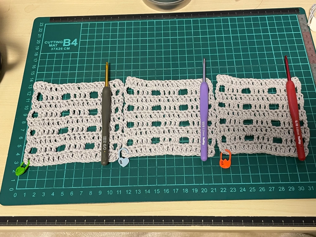 ↑せっかくなので、0.5/0号違いの各色エティモでサイズ感を編み比べてみました
