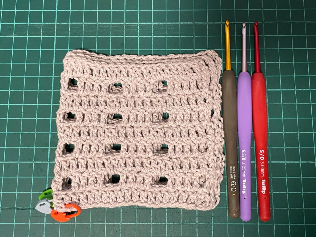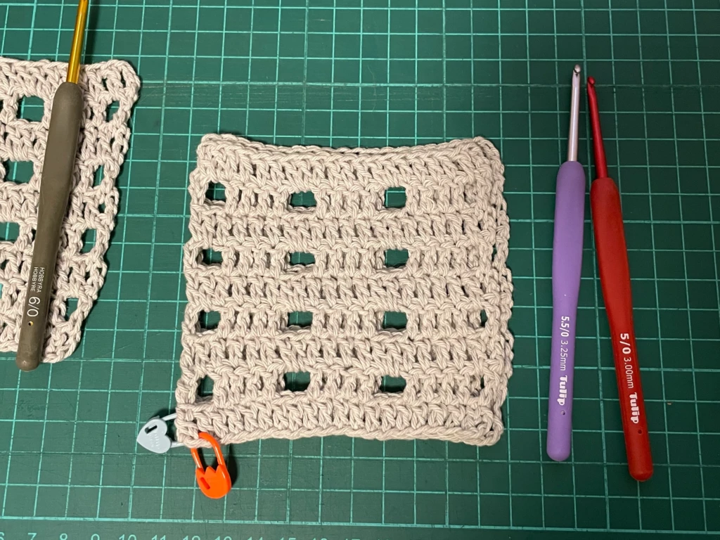↑せっかくなので、ダイソーの20番レース糸でも編んでサイズ比較してみました笑