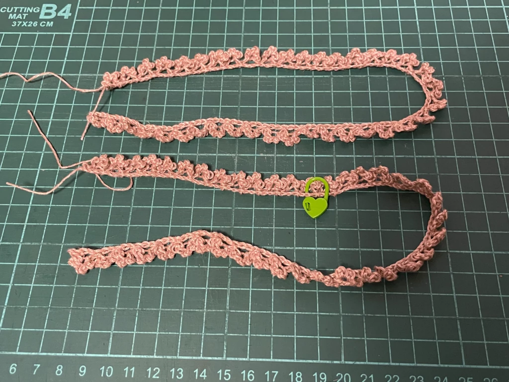 最後の2~3段くらいのところの、長めの鎖編みと長編みを繰り返す部分がどうしても変になってしまうんですよねぇ