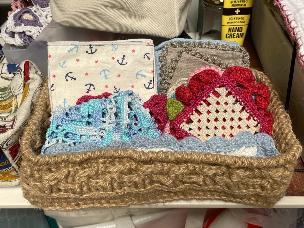 編んだモチーフ関係は、基本的に自分のコースターや娘舞ちゃん用のお皿マットとして使っているのですが、数が増えすぎて仕舞う場所に困ってきたので、まとめて入れられるカゴを編むことにしました