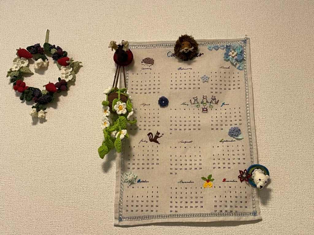 ↑ブローチなのでファブリックカレンダーにつけてみました。可愛いです