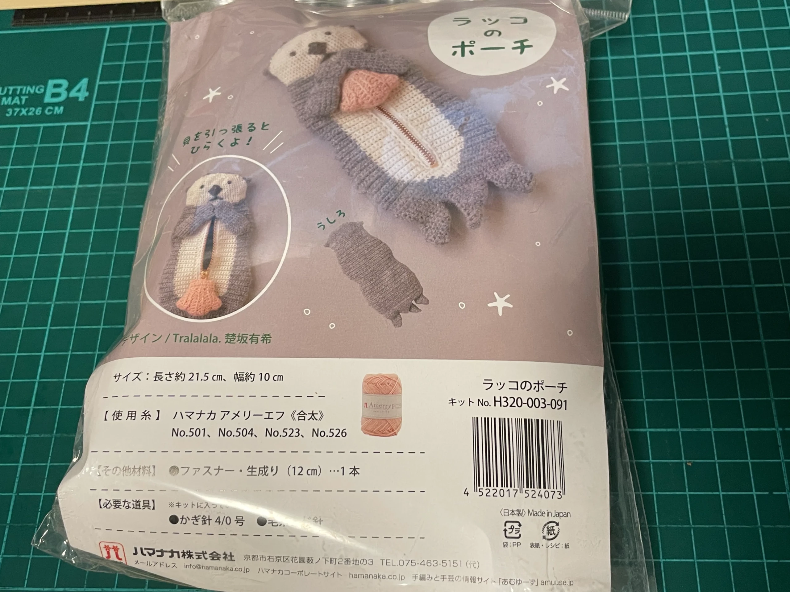 少し前から人気でよく見かけるハマナカさんの『ラッコのポーチ』のキットをお迎えして編んでみました