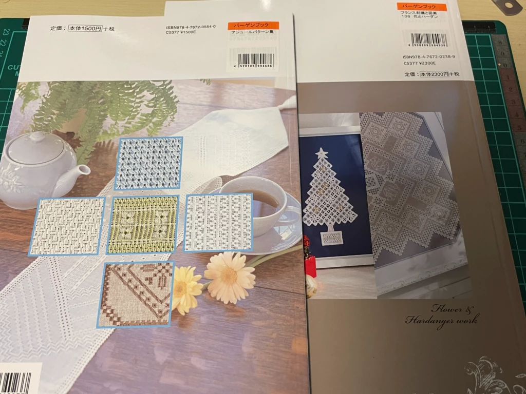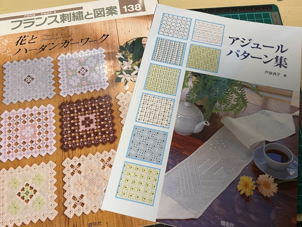 ↑『フランス刺繍と図案138』の『花とハーダンガーワーク』と『アジュールパターン集』です