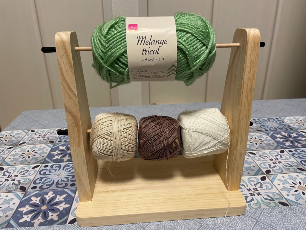 以前購入した分解して持ち歩けるタイプのヤーンホルダーもお気に入りで使用しているのですが、複数糸で色替えして編むときにいちいち入れ替えないとならないのがちょっと不便だったんですよね……